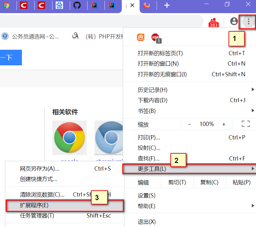 点击浏览器右上角的菜单键图标,依次选择“更多工具”-“扩展程序”。(如下图)