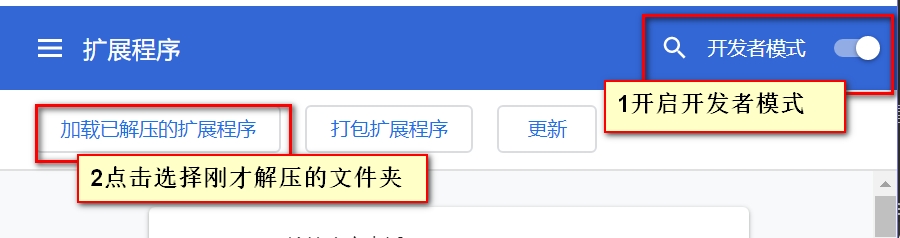 进入扩展程序页面后,开启“开发者模式”,点击“加载已解压的扩展程序”,选择之前解压缩到的文件夹(如下图)