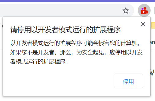 关闭谷歌浏览器后重新打开,会出现提示“请停用开发者模式”,记住 一定不要点击"停用",选择右上角关闭按钮即可。(万一失误点击了,请按步骤2、3操作即可)
